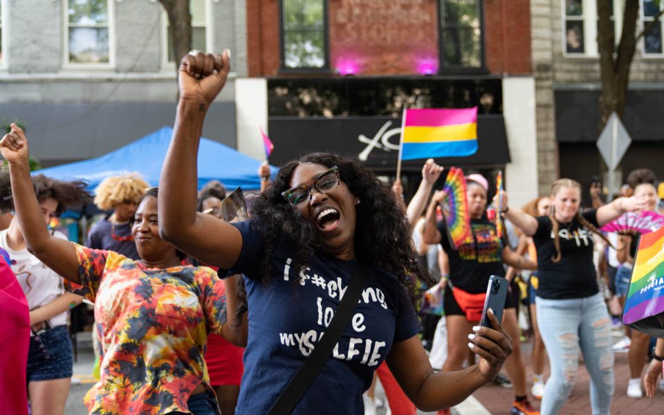 Featured photo: Attendees dance in the streets at Greensboro Pride 2022 (photo by Carolyn de Berry)