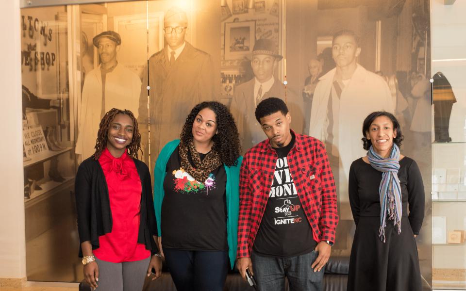 [Pictured: Alexis Anderson, April Parker, Irving Allen and Kristen Jeffers. Photo by Stephen Charles, in the lobby of the International Civil Rights Center & Museum in downtown Greensboro.]