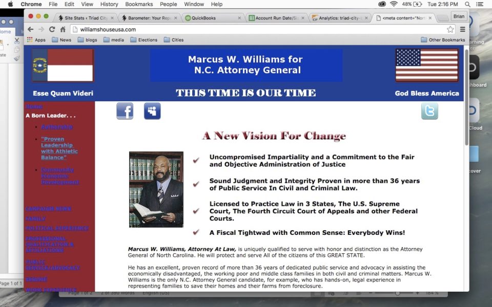 Williams’ site looks like a blog straight out of 2002 — dense with text, quotes from the 1990s in fine print on the margins, counterintuitive navigation. A quote, “Proven Leadership With Athletic Balance,” hyperlinks to PDFs of his high school yearbook pages, which document some pretty impressive accomplishments.