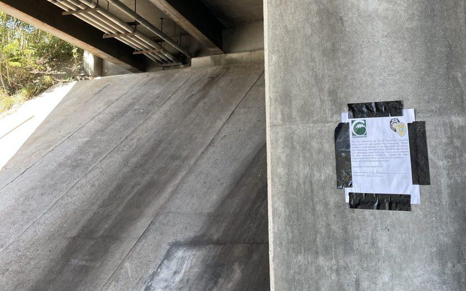 Featured photo: A photo of a notice that a Greensboro police officer had posted under a bridge near the Interactive Resource Center, informing those taking refuge there that they were “trespassing” on city property. (photo courtesy of GSO WHOA)