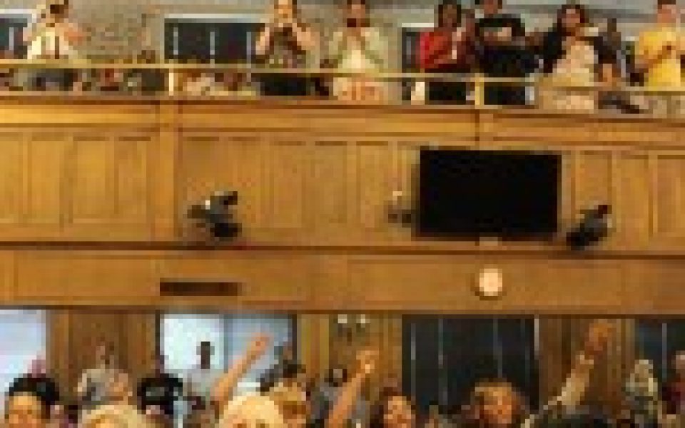 What started with the Rev. Julie Peeples, the Rev. Anthony Spearman and Rabbi Fred Guttman standing and interrupting the meeting turned into the overflow crowd chanting, “Stop suppressing the vote” followed by “Let the public speak.”