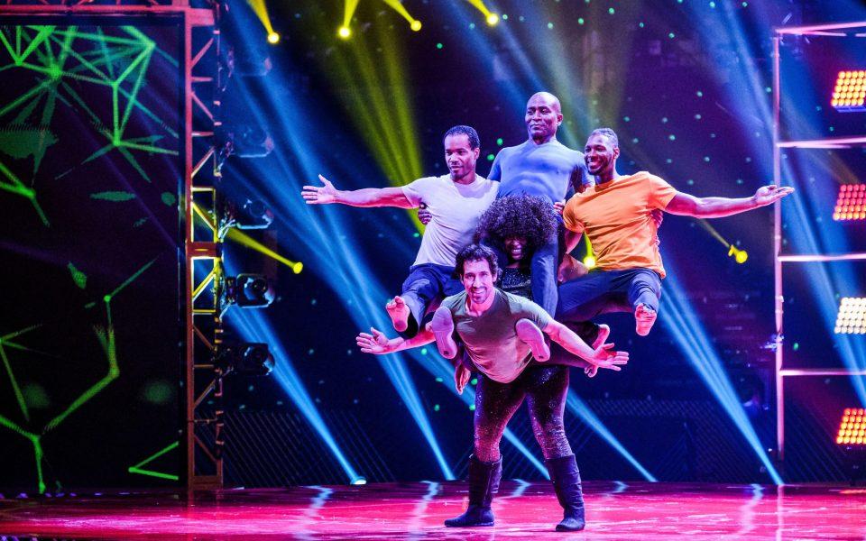 Anima takes the stage again with four men joining her, to which Kreischer hilariously guesses they will try to “beat her up.” She proves him wrong as the first man hops on her shoulders. Amina then raises her arms parallel to the floor and spins like a helicopter, showing that balancing the man is quite literally light work. The second man heads toward Amina with a running start but ends up turning backwards and wrapping his legs around her waist.