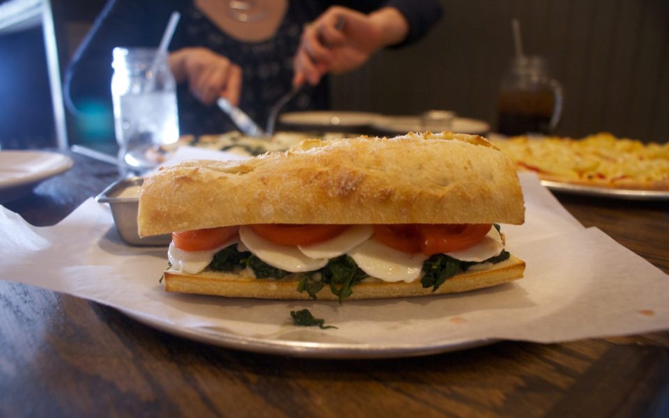 I tried a slice of a friend’s mac & cheese pizza, and another from a friend’s Popeye pie with spinach, mozzarella, ricotta and garlic. We would all give both a favorable rating, but I preferred my sandwich nonetheless. The cooked down spinach counterbalanced the light cheese and cool tomatoes, helping the restaurant’s namesake shine.