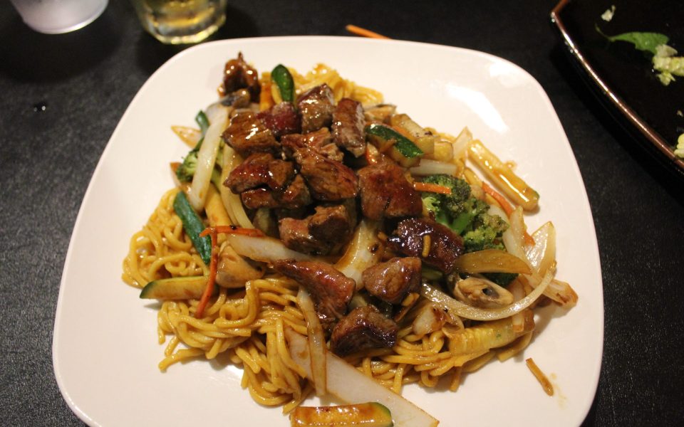 The ramen looked more like lo mein noodles topped with hibachi. Served on a plate, both of our entrees came without any sort of broth. I didn’t understand.