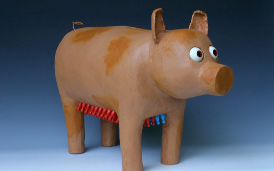 A small room houses works from Casey Allen and Jim Kransberger, who match lighthearted forms with searing political commentary. Jim Kransberger’s “PORK.gov,” a mixed-media sculpture of a pink pig — think Platonic piggy bank — features rows of red and blue nipples made from “Sorry” game board pieces.[pullquote]Learn more at greenhillnc.org and visit at 200 N. Davie Street (GSO).[/pullquote]