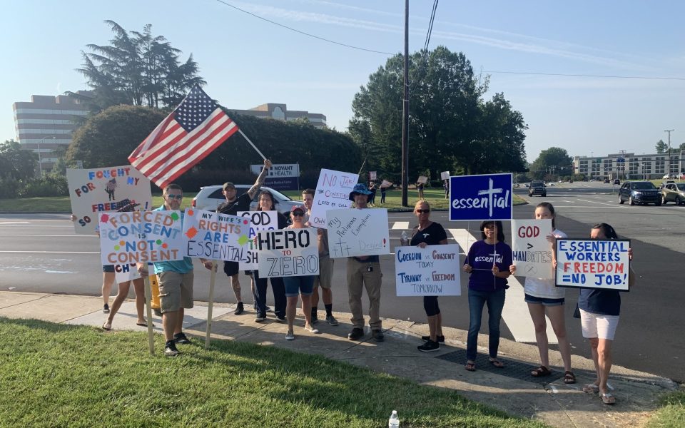 Featured photo: Protesters gathered outside of Novant Health on Aug. 9 to protest the hospital system’s recent vaccine mandate for their staff. (photo by James Douglas)