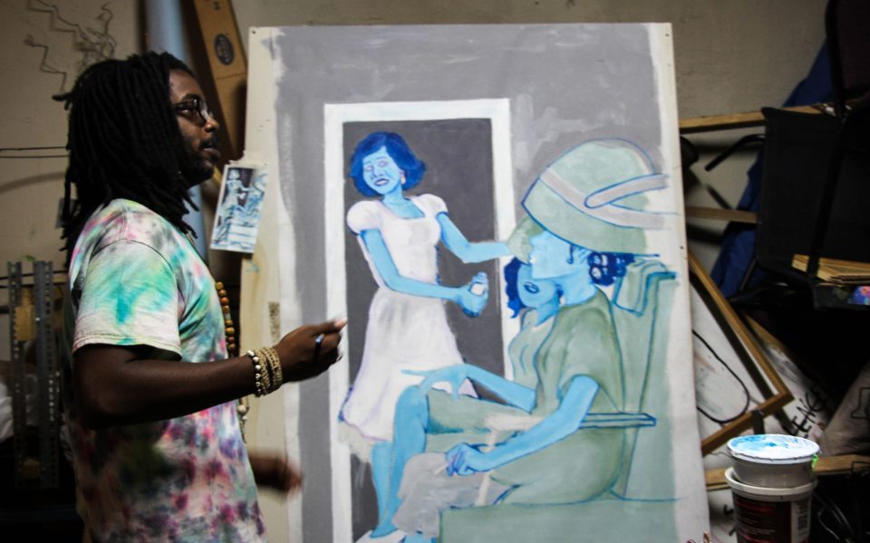In one corner of his studio, a large, rectangular panel is painted with the outline of women sitting in a hair salon. It’s a work in progress but when he’s done the panel will be placed as a mural on the door of an old hair salon in East Winston. He hopes that the finished project will be used to commemorate what he considers as an important era of the community’s history.