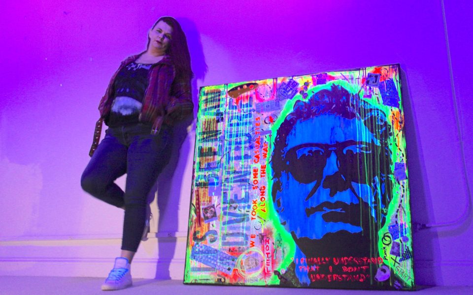 Other celebrities that Tomie chose for the show, which spans about 30 pieces total, include Amy Winehouse, Carrie Fisher and artist Jean-Michel Basquiat. To create the works, Tomie says she scavenged for used canvases at Goodwill or Reconsidered Goods. She used glow-in-the-dark and UV paints to create eye-popping, luminescent works that reveal additional layers when viewed under blacklights, which will be set up during the show’s opening. She also added little trinkets to many of the canvases like fake drugs that represent the ways in which some of the celebrities died. She calls the combination of it call “trash pop art.”