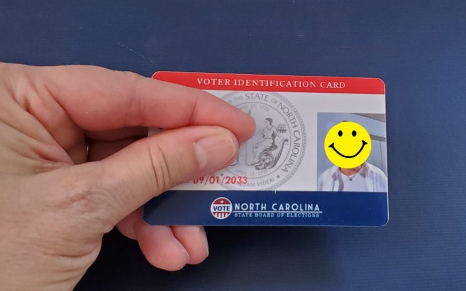 Moments later the whirring printer spit out a plastic red, white and blue ID card bearing my image, the North Carolina State Board of Elections logo, and an expiration date set ten years from now.