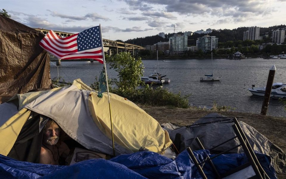 Featured photo: Frank, a homeless man, sits in his tent with a river view in Portland, Ore. (photo by Paula Bronstein/The Associated Press)