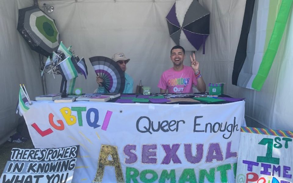 Featured photo: A picture of Shane Cricket and some friends at an Asexual and Aromantic booth at a Pride Festival. The poster at the bottom that says “There is power in knowing what you don’t want.” (courtesy photo)
