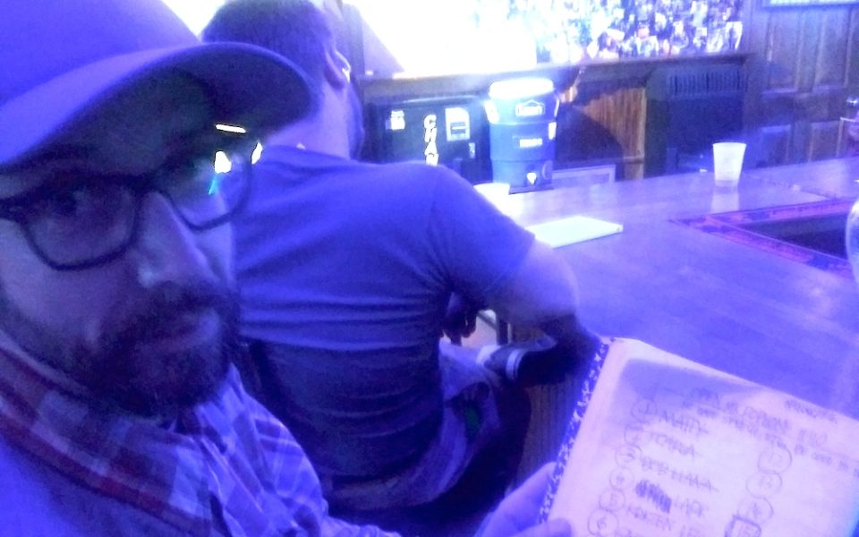 He’s about to go on, so he finalizes the list in the notebook. At the Flatiron he used a chalkboard on the wall, and at New York Pizza he wrote it on a pizza box, until he felt guilty for wasting a whole pizza box, so he started stealing the white sheets of paper from the folded boxes and using that. He started using the notebook after he settled in here at Westerwood.