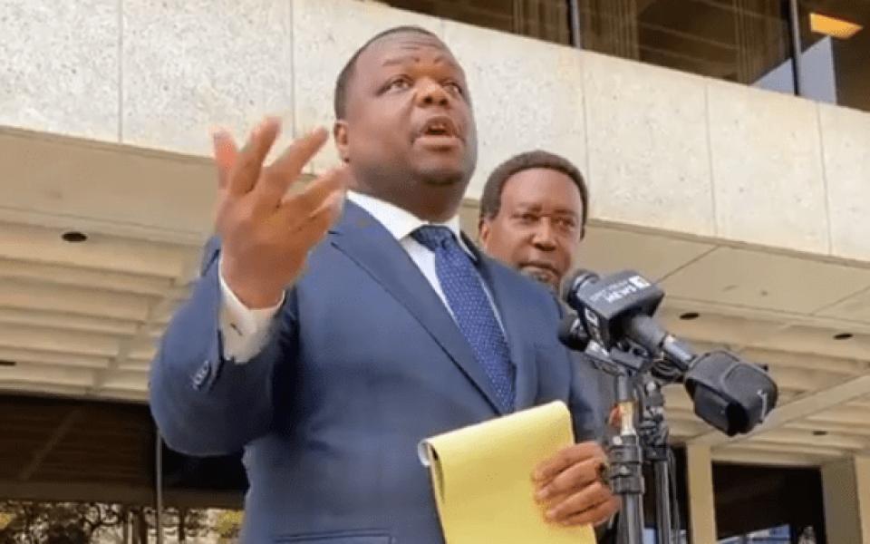 Featured photo: Attorney Harry Daniels speaking at a press conference about Nasanto Crenshaw on April 12, 2023. (screenshot)