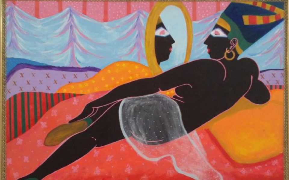 Her 1991 acrylic on canvas “Nefertiti” now adorns a far wall at the Delta Arts Center. The Egyptian queen’s race remains a topic of debate but, here — like many artists of the African diaspora — Miller claims her as a woman of black ancestry. The wealthy era of her reign alongside husband Akhenaten is reflected in eye-catching patterns and vivid colors: In the foreground of lush swaths of drapery she lies on a bed of maroon, gold and purple — colors associated with royalty — and her state of repose clothed in only sheer, angel-blue fabric indicates royal standing. Nefertiti rests on a saffron-orange pillow, perhaps a nod to Aten, or sun disc, the sole god worshipped after the religious revolution she led upon ascension to the throne. Viewers catch her gazing into her own eyes without expression in the golden, ovular bedside mirror. Is this how she sees herself, or a reflection of the observer’s gaze?