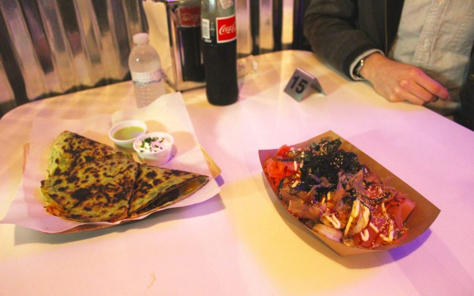 The menu at Bandito Bodega is split between little and big options, though in the case of the “small” kimchi quesadilla, the label is a misnomer. (No complaints from me though, and it’s delicious.) The standby Asian-style and baja tacos are there, at $3.50 a pop, as well as a few apps including age dashi tofu, pan-fried gyoza (a dumpling) and nachos with house spicy pickles, queso fresco, chipotle crema and guac.