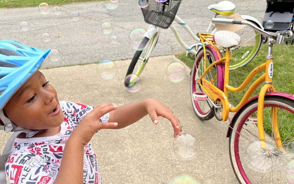 Featured photo: Major plays with bubbles at the Barber Park Community Bike Shop (photo by Sheldon Herman)