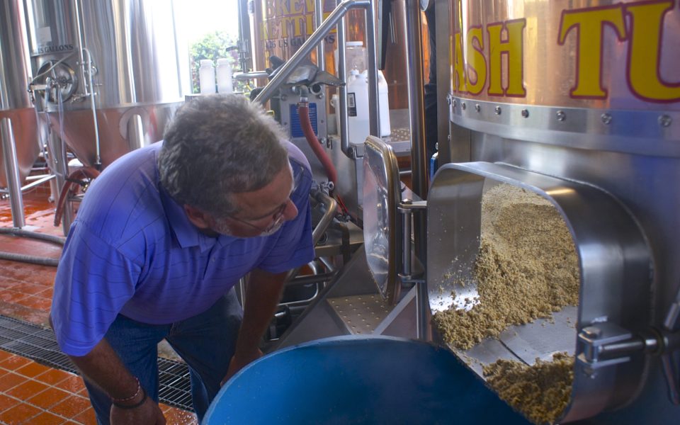 Instead he sits on top of a stack of Briess malt and ingredients bags pushed up against a wall of Isbell’s brewing space, then standing and walking a couple paces to look inside the mash tun. There’s a thin layer of “top dough,” about two inches, covering the spent grain Isbell was using to make the brewery’s two wheat beers. Reaching his arm into the open tub-like container, Sammartino sticks his finger into the grain and tastes it. The mixture looks like oatmeal that is somewhat disintegrated and compacted, and the taste isn’t too far off either.
