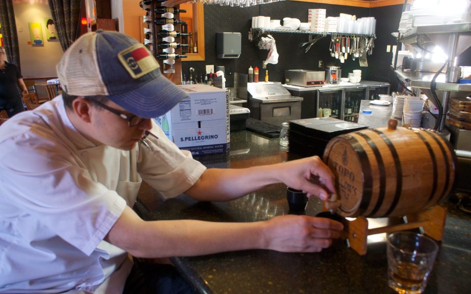 About four months ago, Willow’s Bistro kitchen boss started the process of aging whiskey and several other ingredients in a five-liter countertop barrel from Topo, an organic distillery based in Chapel Hill.