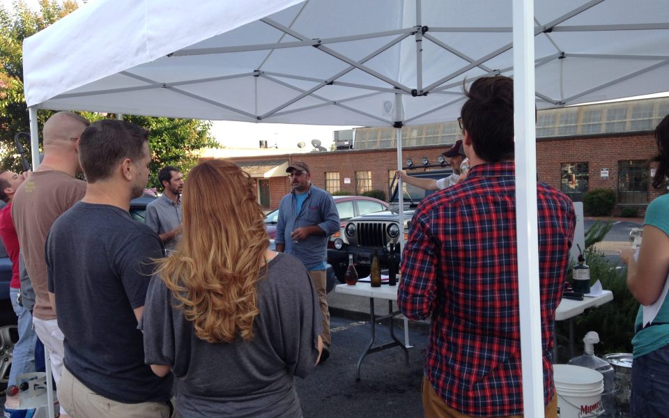 Ten workshop participants gathered beneath a white tent in the parking lot of Winston-Salem’s City Beverage to learn how to make mead. Usually made with water, honey and yeast, mead has a long history in many cultures around the world. There are numerous variations depending on what else is added and the type of honey and yeast used.