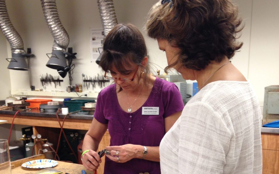 At another table, Sara Sloan Stine, lead metalsmith instructor at Sawtooth, completed the craft by punching holes in the metal and threading Shepherd’s hooks through them, so they become dangling earrings I wore immediately. I would’ve preferred if this had been more hands-on, but in the absence of waiver forms, I can understand the need to punch holes for people who have been drinking.