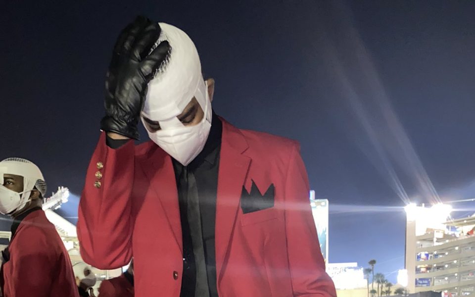 Dressed in red jackets, black pants and black gloves, also with white bandages over their faces, the dancers first appeared on stage as the Weeknd sang “Can’t Feel My Face” while running through a hallway lit by titles of his songs. With choreography featuring marching and head snaps as they began the field portion of the show, they served as an army of the Weeknd clones as they marched alongside him. Among that army was North Carolina A&T State University senior Bentley Tanner.