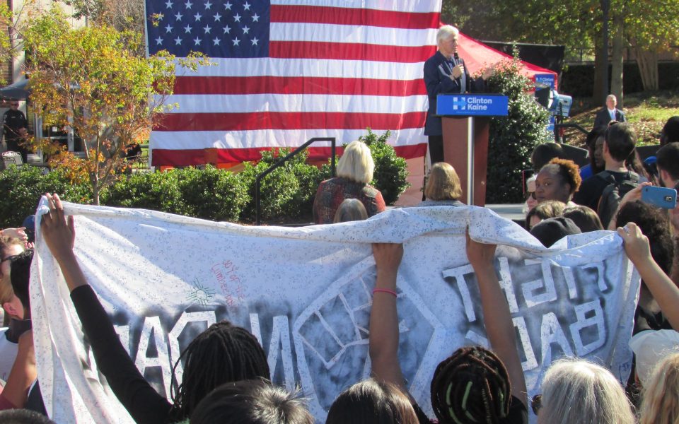 The protesters’ banner expressed support for the Standing Rock Sioux and allies who are attempting to block the Dakota Access Pipeline. Lucia Sedda, a UNCG sophomore who participated in the protest, said the protesters’ other aim was “to hold Bill Clinton accountable for the crime bill that ties in with the problem of mass incarceration of black and brown people today.”