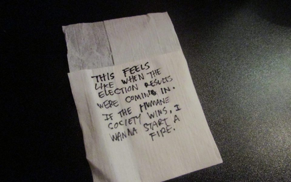 “This feels like when the election results were coming in,” the note read. “If the Humane Society wins, I wanna start a fire.”