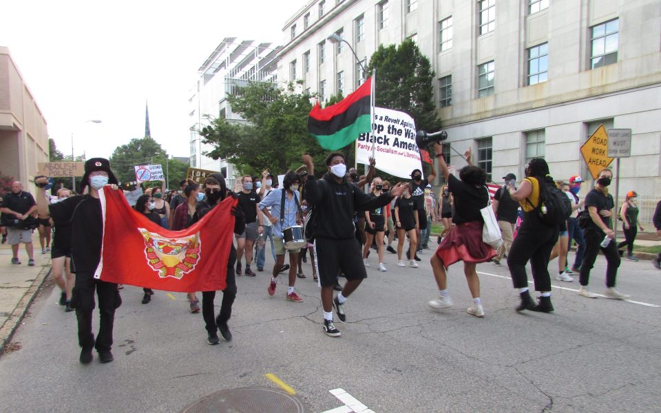 Many of the speakers at the protest billed as “Smash the Police State: Portland, Gastonia, Roxboro” linked abolition of the police with revolutionary aims to uproot systemic racism and overthrow capitalism. Hosted by Smash Racism Raleigh, several groups that have been active in protests for racial justice in the Triangle and beyond signed on, including three chapters of Democratic Socialists of America, Central NC Party for Socialism and Liberation, Wake County Black Student Coalition, Mapinduzi, Wake County Black Student Coalition, and the Working-class & Houseless Organizing Alliance of Greensboro.