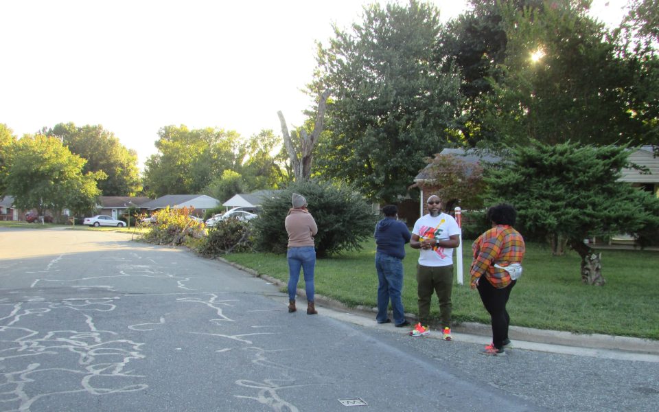 By 6:30, about 10 people, including organizers from Greensboro and Graham who have been involved in campaigns for racial justice, had gathered at the intersection where Hill was killed. One group arrived with flowers, and set off on foot to deliver them to Hill’s parents. Organizers inquired among neighbors what they could do to support Hill’s family, and tentatively discussed plans for a memorial gathering.
