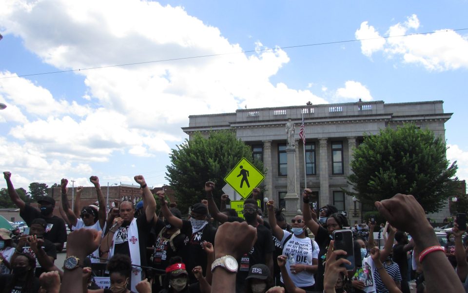 “Take a moment to look around you,” Dejuana Bigelow of Burlington exhorted marchers at the Historical Courthouse in Graham. “This has never, ever happened in Alamance County, in the town of Graham. Look around. It is not just Black people. I see my white friends. I see my Hispanic friends. I see my Asian friends…. Yes, hate is here. Hate has always been here. We didn’t come for that.
