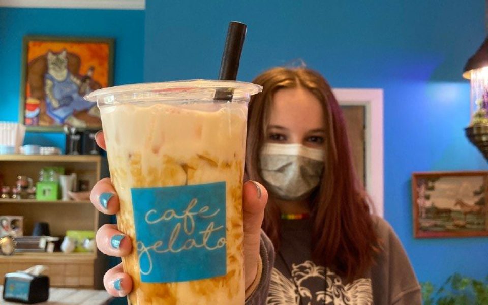 Featured photo: Amelie Apostol holds up a Tiger tea from Café Gelato (photo by Sayaka Matsuoka)