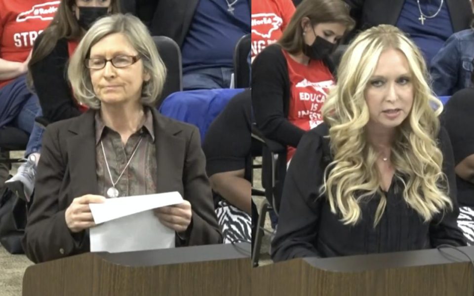 Featured photo: Deborah Tuttle (left) and Regina Garner (right) spoke at the Winston-Salem/Forsyth County School Board meeting on Feb. 22 in an apparent coordinated effort to serve the school board surety bonds. As Tuttle was speaking, Eric Jensen crossed the roped boundary towards the dais and was arrested by security. (screenshots)