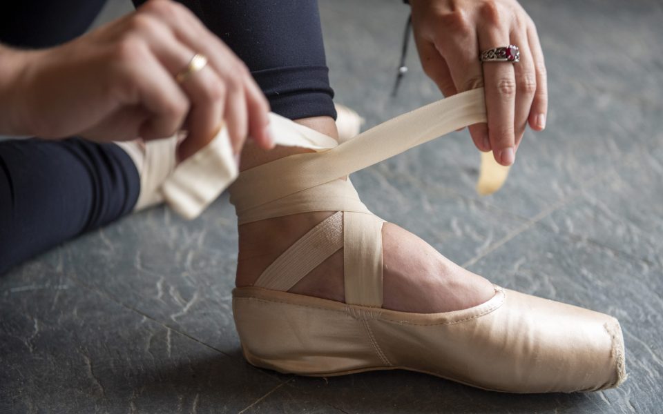 Featured photo: Kira Arauz ties her point shoes in the new Gate City Theatre studio in Greensboro, N.C. (photo by Juliet Coen)