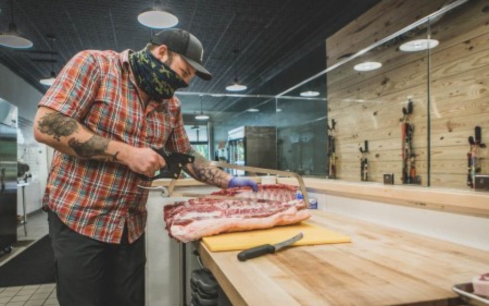 Featured photo: Matt Pleasants of Smoke City Meats cuts meat behind the counter. All photos by Carolyn de Berry.