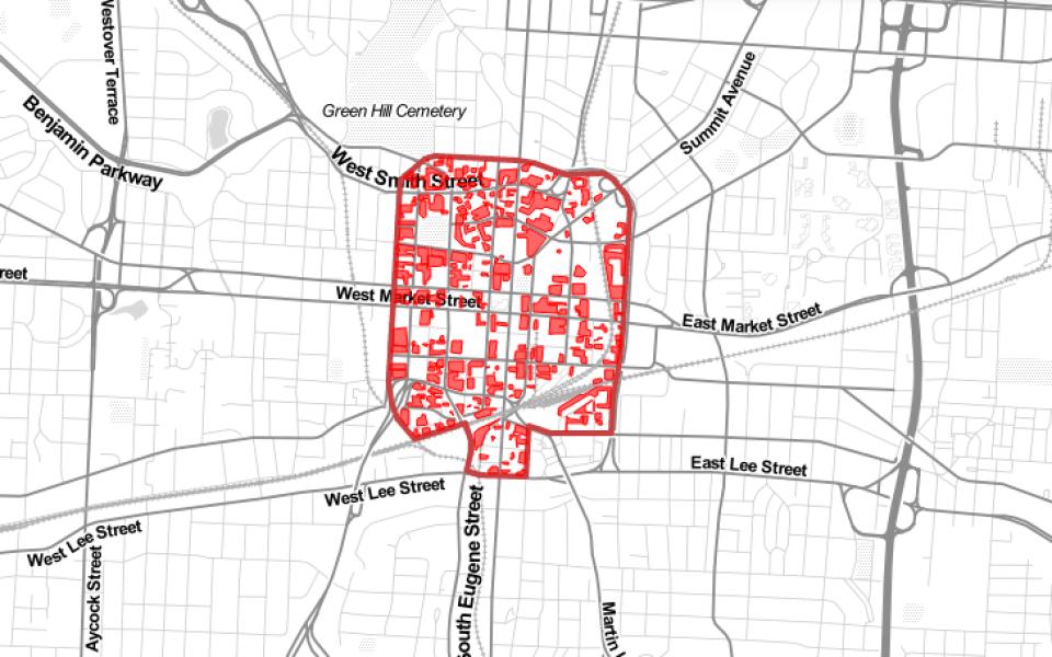 Featured photo: Parking lots in downtown Greensboro highlighted by Parking Reform Network (screenshot)
