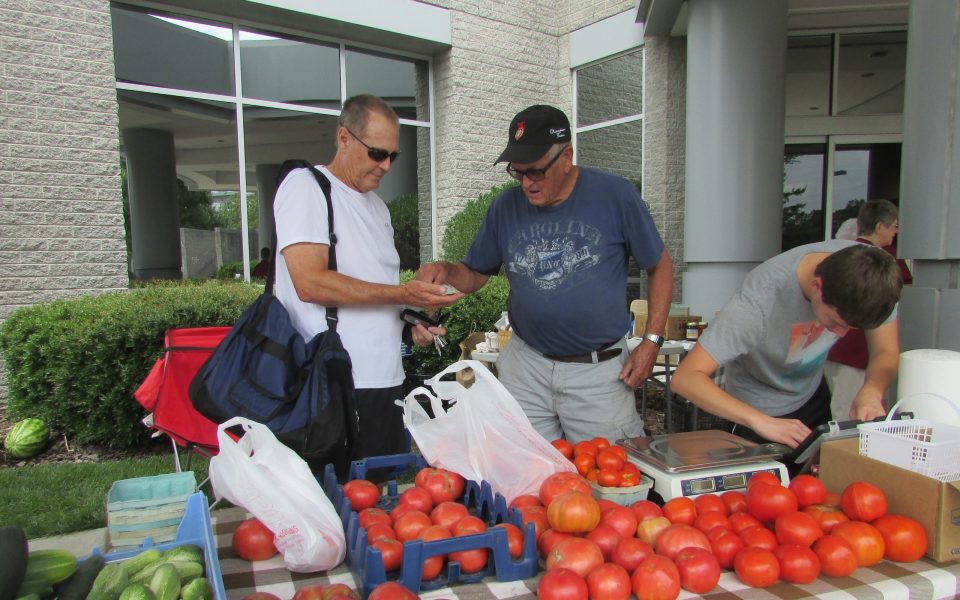 Every Thursday, Lee Gann and Bobby Alcon set out their produce on tables flanking the entrance of the Fitness Center at High Point Regional Hospital. Their customers — nurses, hospital volunteers, patients and visitors on their way in to get their workouts —trickle past, peeling off dollar bills for peaches and tomatoes, baby potatoes and zucchini until the farmers pack away their produce and fold up their tables at 3 p.m.