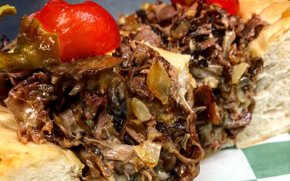 He shaves a few slices off a roast and slides them on the grill with some chopped mushrooms and onions, lays a couple slices of provolone atop and then a dip of jus before he flips it, chops it and places it in a buttered, grilled hoagie roll with a couple of sweet peppers.