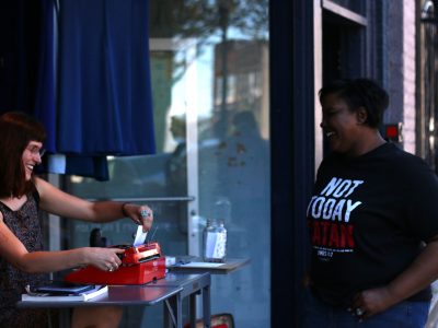 Pedestrians dictate postcards to Donald Trump