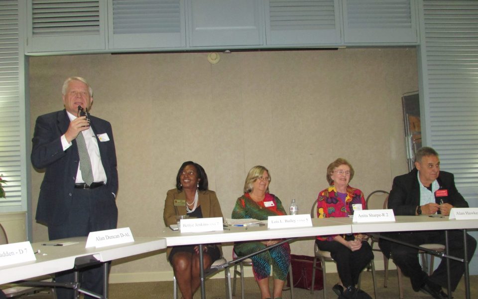 Alan Hawkes issued a withering denunciation of opponent Alan Duncan at the forum. “If I were an incumbent on the board of education,” he said, “I would be absolutely ashamed of myself for 50 percent reading proficiency in third grade and 39 failing elementary and middle schools in Guilford County.”