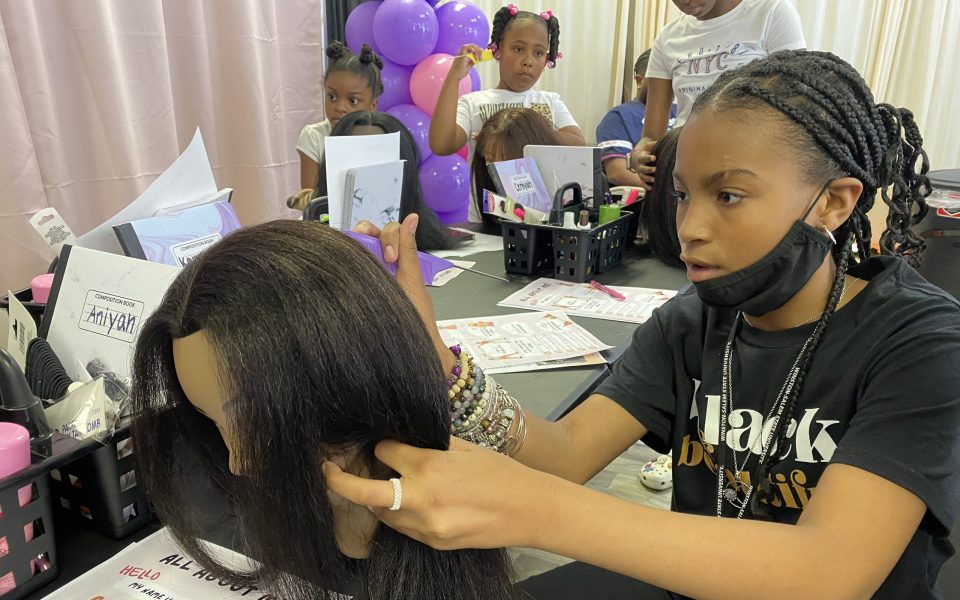 On Sunday, excited chatter filled the room as young girls studied Washington’s techniques, turning to her and each other for help. They rocked various natural hairstyles, from box braids to two-strand twists. The mannequin heads, one in front of each girl, had ranging skin tones and facial expressions, but they all sported the same kinky-straight hair texture. They also have their own black basket, full of “About Me” worksheets, notebooks for notetaking and styling tools like combs, gels and ponytail holders. To complete the cosmetologist fit, each girl wore a bright-pink stylists’ apron.