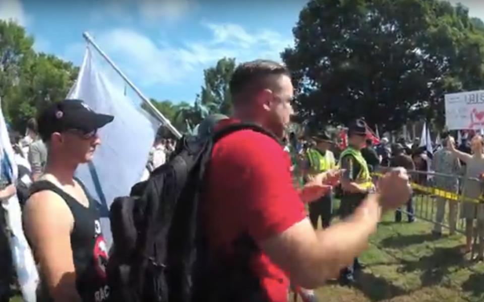 Another group of white nationalists mocked a white woman holding a sign reading, “Love is love.”