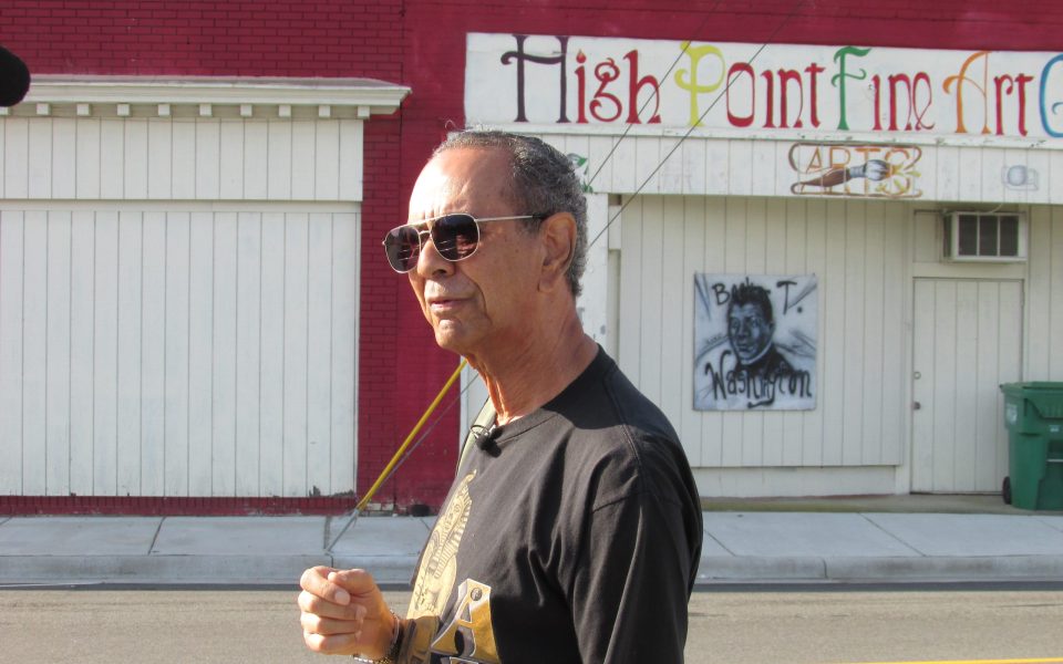 Still, it’s a pretty lively scene as Glenn Chavis, the pre-eminent historian of African-American life in High Point, gives a television interview to Spectrum News. Just as the cameraman sets up the shot, a barefoot woman fashionably dressed in black slacks and a pink top takes a seat on a metal bench, removes a flattened cardboard box and then reclines like a 1940s film siren with her arm flung back. Just then, a man riding past on bicycle while smoking calls out, “Hello people in TV land! Goddamn, I dropped my cigarette.” A man in a pickup blows his horn to greet Chavis, a familiar figure on the street.