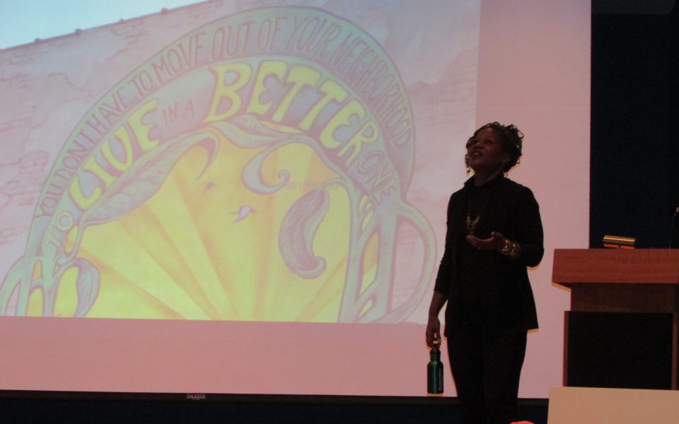 Advancing her PowerPoint presentation, she acknowledges an admiration for the design even if the message on the poster isn’t flattering. It includes a quote from her — “We like to see the work that we do as self-gentrification” — coupled with an attribution to “local sellout Majora Carter,” hash-tagged #ColumbusSyndrome.