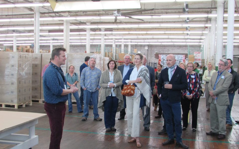 The vibe of business, which provides workspace furniture for tech companies like Facebook and LinkedIn, is more enlightened collaboration than red-blooded pride and American exceptionalism; the company is Belgian, after all. Tom Van Dessel, the company’s cheerful and athletic CEO, showed off the company’s fleet of roadster bikes — purchased in anticipation of a future greenway — to his industry peers, and mentioned the raised beds surrounding the building that provide food for employees, noting that the factory is located in a food desert.