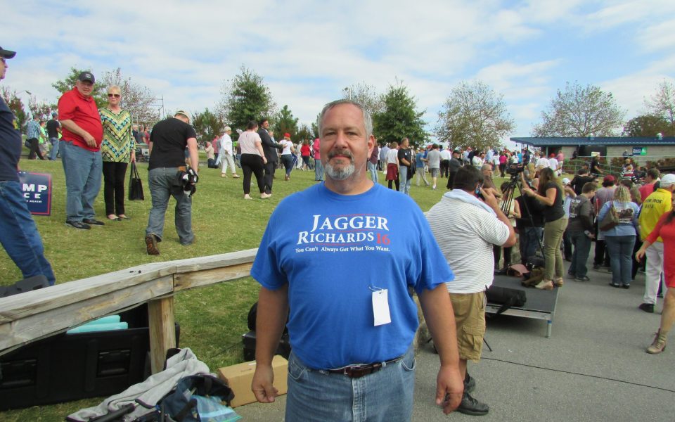The multi-generational crowd reminded me of a rainbow gathering, and stylistically the comparison wasn’t too far off, considering the large cohort of people unostentatiously dressed in denim and faded working-folks attire, men with full beards and women with long hair tied back in utilitarian fashion. From the senior citizen wearing an oversized Uncle Sam hat to the dude sporting a biker-style full beard and shaved head while dressed in military fatigues with a T-shirt inscribed with the word “infidel,” they seemed bound together as a tribe of misfits hopelessly outnumbered by a hostile mainstream. There was the African-American man who chanted, “Blacks for Trump,” during the candidate’s litany of inner-city woes and drew looks of appreciation from the mostly white crowd. There was the white man with short sandy hair wearing an American-flag collared shirt who made me think of a right-wing Hunter S. Thompson character — someone who believes deeply in America and yet feels alienated by the America he sees before him. Out of sorts with society, they’re finding community with each other and an imperfect candidate whose demand for loyalty is embodied in an early Stones song in the rotation that repeats the desperate entreaty: “You gotta tell me you’re coming back to me.”