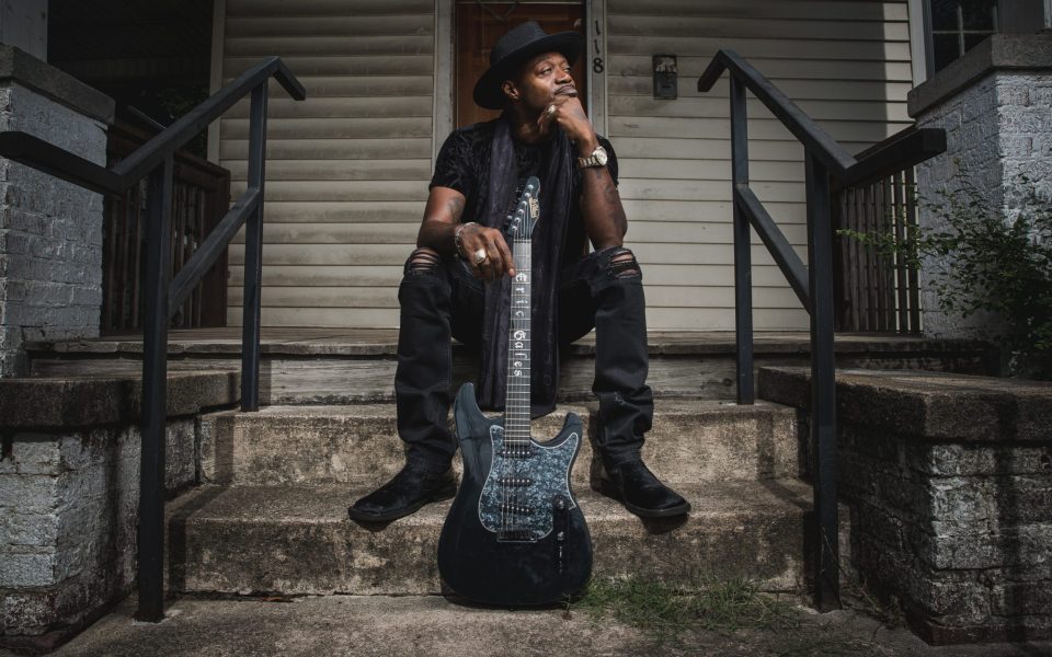 Now Eric Gales has his guitar out, the black one with his name etched on the fretboard, a black Calvin Klein scarf and a wide-brimmed black hat, and he’s posing in front of Coltrane’s childhood home. He knots the scarf around his neck.