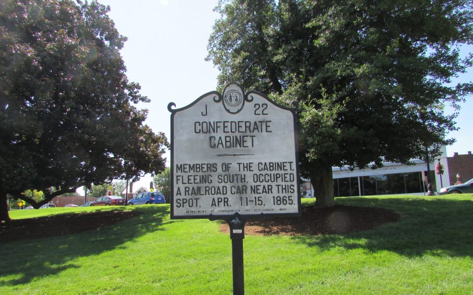 A historical highway marker erected by the state of North Carolina in 1940 that commemorates a meeting of the Confederate cabinet in a railroad car during the same period that Davis conferred with his generals was also defaced with a large X.