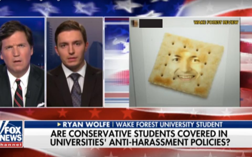 The story claims that Wake Forest University failed to enforce its anti-bias policies on Wolfe’s behalf because he is white. The case concerns Wolfe’s October 2016 complaint against six students who disparaged him with food-related insults that alluded to his status as a white person during the 2016 presidential campaign. During a panel on the future of the Republican Party at a campus event that included Wolfe and three other white students, student Char Van Schenk commented on Facebook with a photo of four saltine crackers, writing, “Loving the lineup.” The theme continued when another student handed Wolfe a box of saltine crackers after the event, and again when yet another student photoshopped Wolfe’s face onto a saltine cracker and bandied it about social media. The same student who handed Wolfe the box of crackers also responded on Twitter to Wolfe by tweeting, “If you don’t get your mayonnaise lookin asss [sic] out of my mentions….”