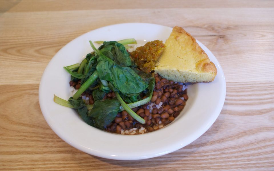 I ran into former Krankies employee Eric Weyer — the red-bearded Eric behind Hoots brewery and bar (as opposed to his more closely-cropped business partner Eric Swaim) — on my way into the newly transformed café. Without a clue of what the menu might entail, I solicited his advice and took it, ordering the Hoppin’ John Plate.