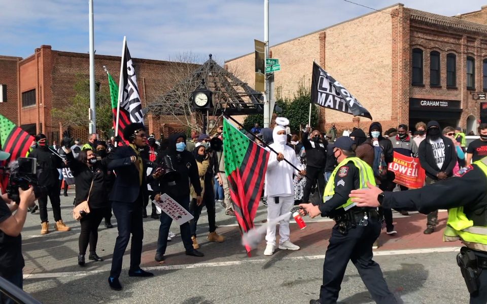 Only minutes earlier, a Graham police officer announced from a loudspeaker that the protest was an “unlawful assembly.” After the organizers were arrested, Graham police officers began deploying pepper spray at protesters’ feet, driving them a block northward.